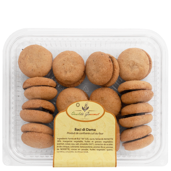 Les baci di dama sont de délicieux petits gâteaux de la tradition piémontaise, constitués de deux petits biscuits à l’amande ou à la noisette et assemblés avec une fine couche de chocolat fondant. Ces petits biscuits, craquants à l’extérieur et moelleux à l’intérieur, sont parfaits dégustés avec un café ou en fin de repas. Leur consistance friable et leur goût équilibré et légèrement amer en font un produit irrésistible pour tous ceux qui aiment les desserts raffinés et recherchés. Idéals pour une pause gourmande ou un moment de douceur.