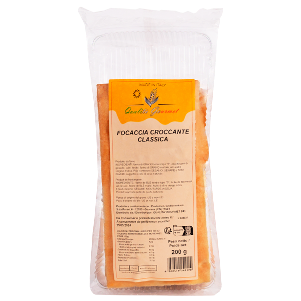 La fougasse croustillante classique est un régal irrésistible, idéale pour toute occasion. Réalisée avec de la farine de très bonne qualité et de l’huile d’olive vierge extra, un levage de la pâte au levain naturel, cette focaccia se distingue par son croquant. Son goût authentique et naturel enrichi d’un léger saupoudrage de gros sel en fait le produit idéal à savourer tel quel ou en accompagnement de charcuterie et fromages, ou encore pour des en-cas gourmands. Parfaite pour tout moment de la journée, du petit-déjeuner à l’apéritif.