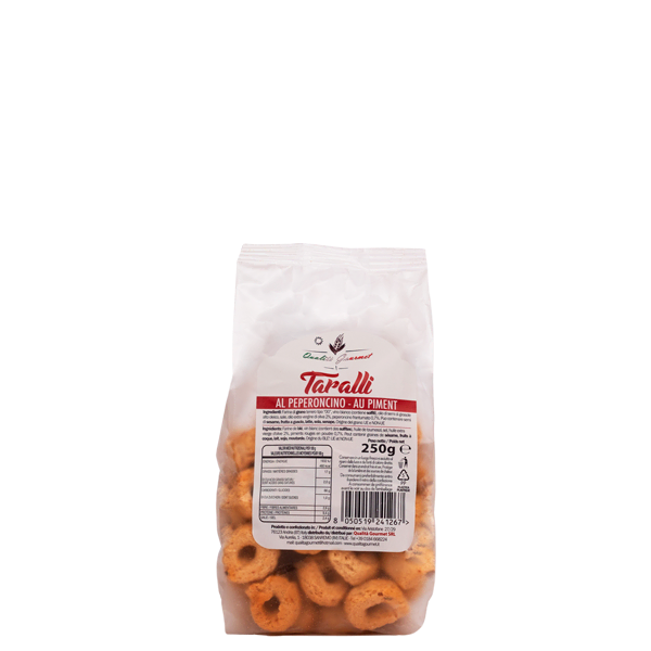 Les taralli au piment sont un produit d’exception piquant et croustillant, parfaits pour ceux qui aiment les saveurs prononcées. Réalisés avec de la farine de très bonne qualité et de l’huile d’olive vierge extra et enrichis de piment, ces taralli offrent une expérience gustative intense qui aiguise l’appétit. Idéals savourés pour un en-cas, pour accompagner apéritif, fromages, charcuterie ou bien grignotés tels quels. Chaque bouchée contient ce piquant agréable qui se marie parfaitement avec le craquant typique des taralli, ce qui en fait le produit irrésistible et parfait pour toute occasion.
