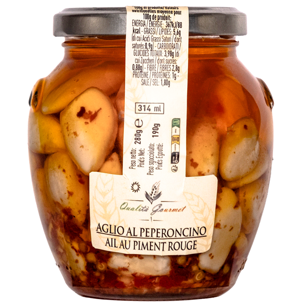 L’ail au piment rouge est un condiment qui allie le piquant du piment au goût aromatique de l’ail. Les gousses d’ail sont délicatement marinées au vinaigre et sont conservés avec du piment rouge dans l’huile de tournesol, créant ainsi un mélange parfait qui apportera une note épicée à bon nombre de plats. Idéal pour enrichir sauces, marinades, bruschette ou bien pour accompagner viandes et légumes, l’ail au piment rouge apportera une touche bien prononcée de vivacité à vos recettes et le piquant bien équilibré du piment en exaltera les saveurs.