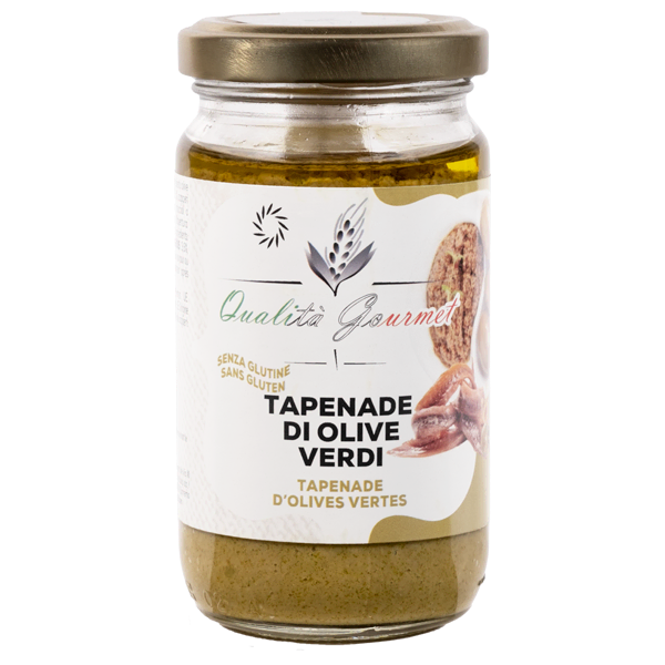 La tapenade d’olives vertes est une délicieuse crème au goût intense et méditerranéen, elle est préparée avec des olives vertes, des câpres, des anchois dans de l'huile de tournesol. Cette recette traditionnelle est parfaite pour enrichir les antipasti, étalée sur des toasts ou du pain grillé, ou bien en accompagnement avec des viandes,du poisson, des légumes grillés. Idéale pour apporter sur votre table un goût authentique et prononcé, la tapenade d’olive vertes ajoute une touche d’élégance et de saveur à vos préparations.