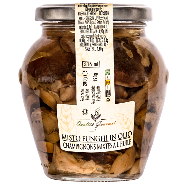 Ce mélange de champignons à l’huile est un assemblage de champignons sélectionnés et pleins de saveur, récoltés à pleine maturité et conservés dans de l’huile de tournesol. Ce produit est idéal pour enrichir antipasti, garnitures et salades, mais on peut aussi l’utiliser pour garnir des bruschette ou accompagner des plats de viandes. Grâce à sa versatilité, il ajoute une touche rustique et authentique à tous les plats et apporte sur votre table les saveurs authentiques du sous-bois en toute saison.